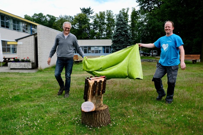 Kroon op de klusdag was het geschenk van de Specialty Chemicals: een nieuw houten muziekinstrument voor in het Muzieklaantje. Frans Wientjes sprak zijn grote dank uit: “Een dag als deze geeft een ieder energie! Op ons 20 ha landgoed ligt altijd werk. Werk waarvoor wij niet de mankracht en middelen tot onze beschikking hebben. Met initiatieven uit het bedrijfsleven als deze zijn wij – en uiteindelijk onze speciale vakantiegasten – heel erg blij.