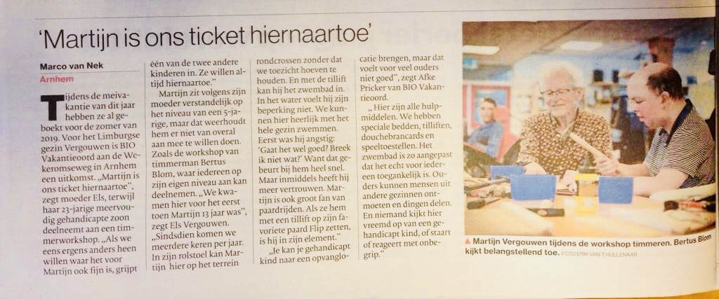 vrijdag 24 augustus 2018 09:53 Vandaag (24/8/18) in de Gelderlander. Zoveel ouders met meervoudig gehandicapte kinderen gunnen wij een vakantie, sámen bij Bio, met het hele gezin.