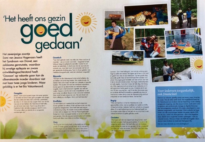 Samen met een verzorgster en haar twee zoontjes genoot ze van haar vakantie bij Bio. Ze vond het fijn dat je de faciliteiten bij Bio ook privé mag boeken: "Een unieke formule. Er zijn heel ruime huisjes met plek voor rolstoelen of speciale bedden. We zouden niet naar een standaard vakantiehuis kunnen gaan en op deze lokatie zijn veel extra dingen mogelijk. Sami is heel sensorisch ingesteld. Daarom is het fijn dat er een snoezelkamer is, een soort ruimte met allerlei kleuren en een verwarmd waterbed. Daar wordt hij heel ontspannen van."